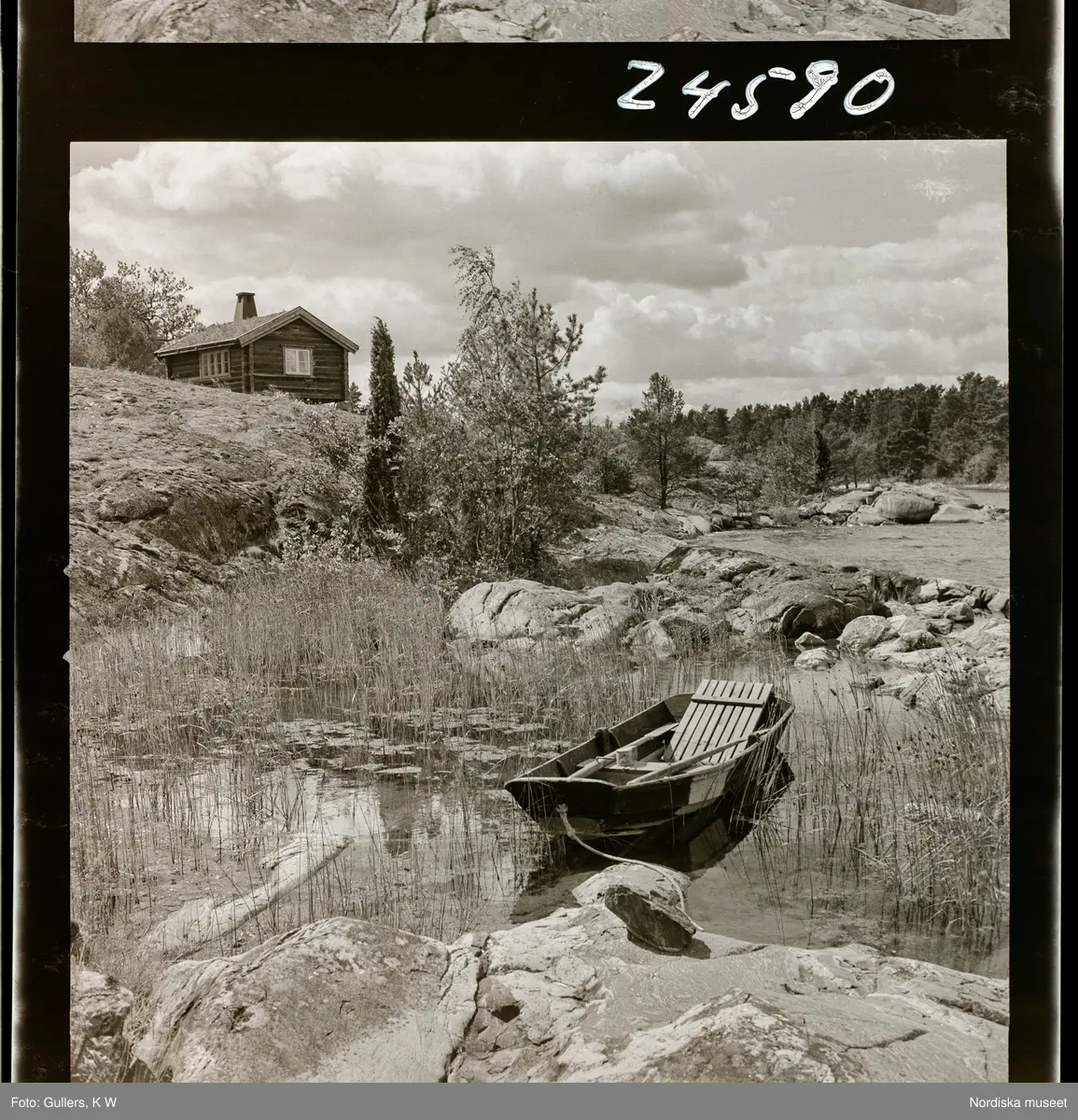 Titel: Ön Lilla Brudholmen. På en klippa ligger en stuga, i förgrunden ligger en båt. Fotografens förteckning/ anteckning: 568/1 Trenter Stieg Sommar-Gåtebo. Tagning ateljén.