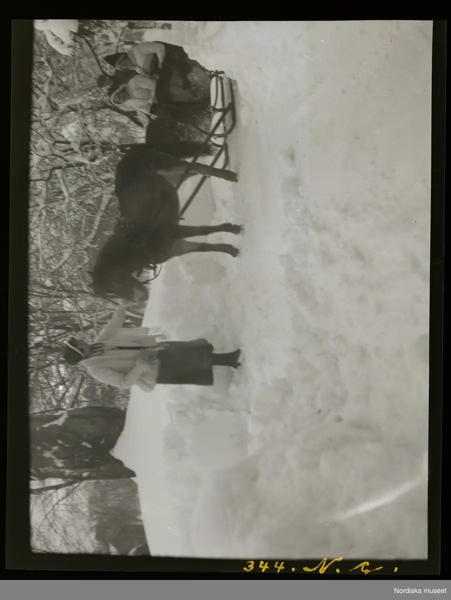 Titel: Kvinnor åker släde efter häst. Skansen, Stockholm.