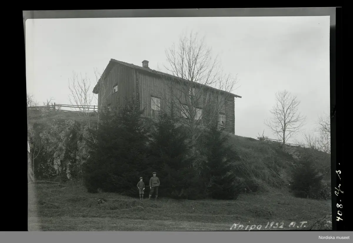 En pojke och en man står nedanför ett bostadshus i trä. Negativet märkt "Knipa 1932 A.T."