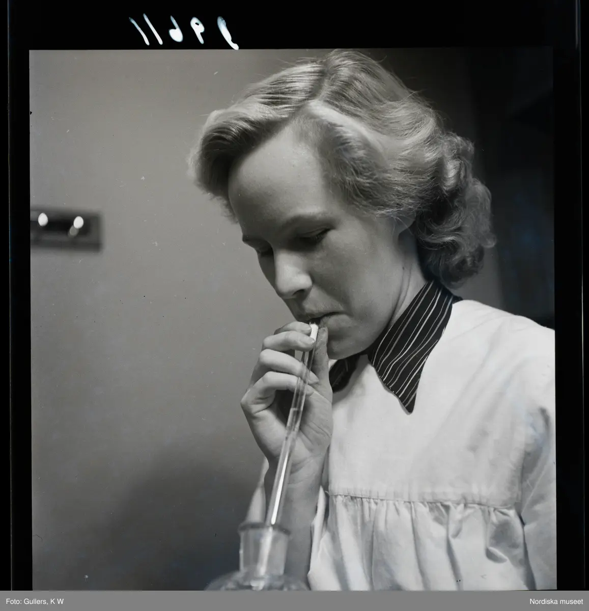 Kvinna arbetear i labb vid Statens Institut för folkhälsan (myndighet verksam mellan åren 1938 - 1971).