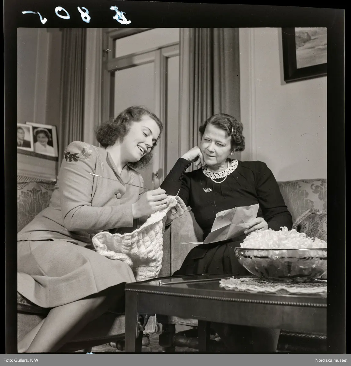 583 Sickan Carlsson för 25an Allers. Sickan Carlsson sitter och stickar, visar en kvinna (sin mor?) sin stickning.