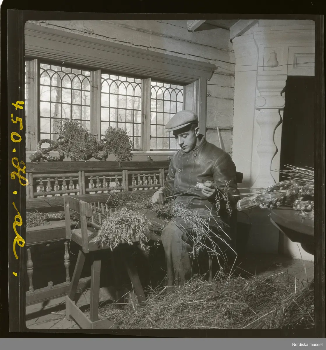 Man tillverkar halmdekorationer. Skansen, Stockholm.