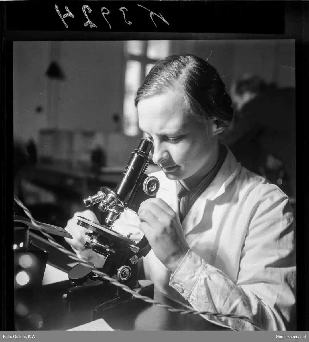 507 D Ultuna. En ung kvinna studerar något i mikroskop.