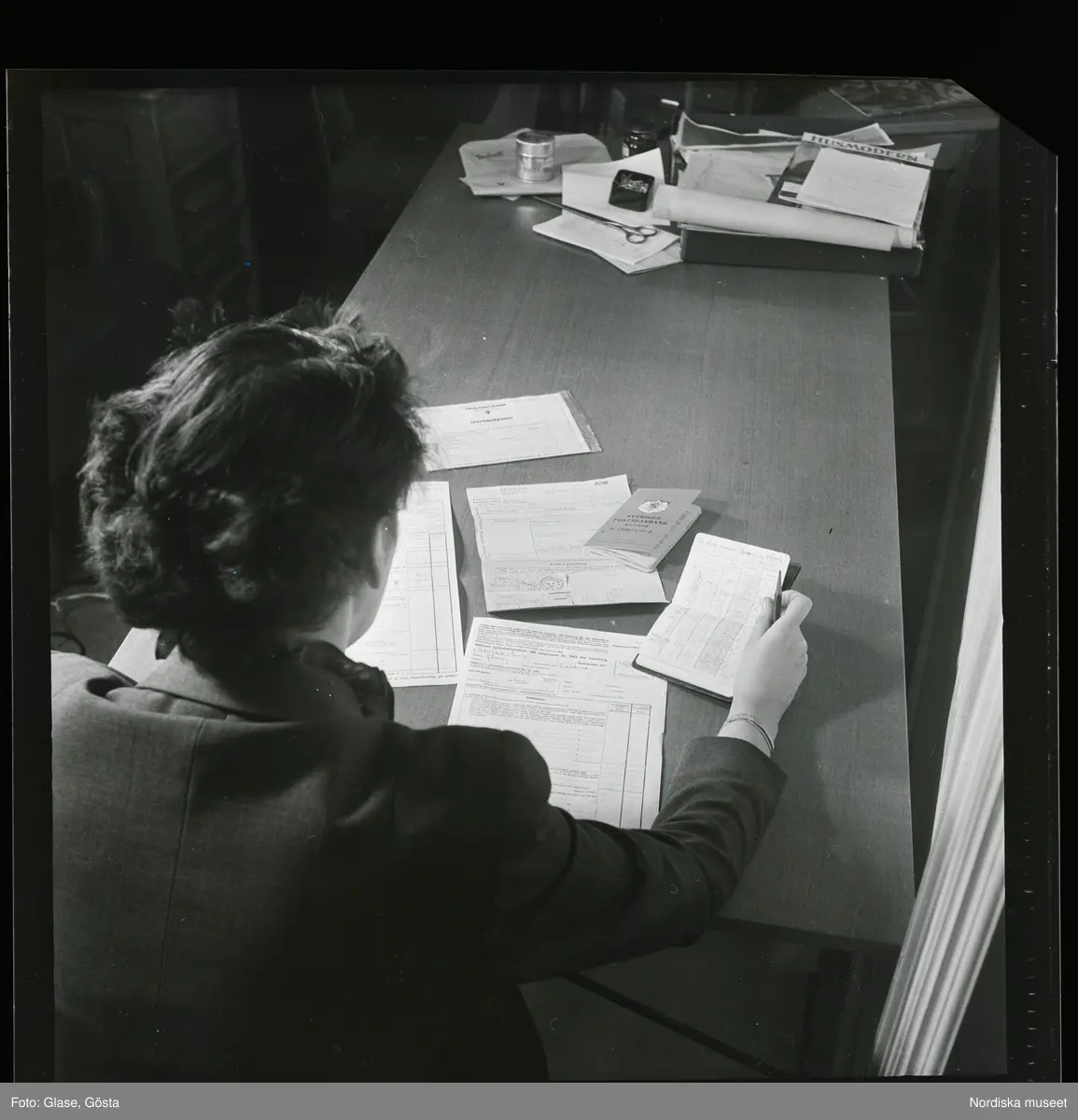 En kvinna sitter vid ett skrivbord med deklarationspapper framför sig.