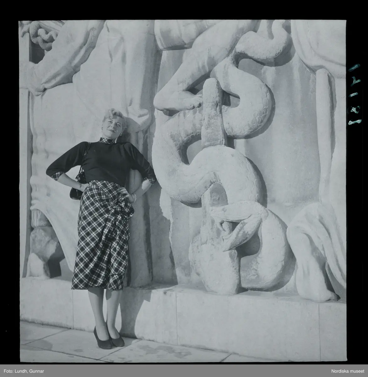1950. Paris. Kvinna poserandes vid relief