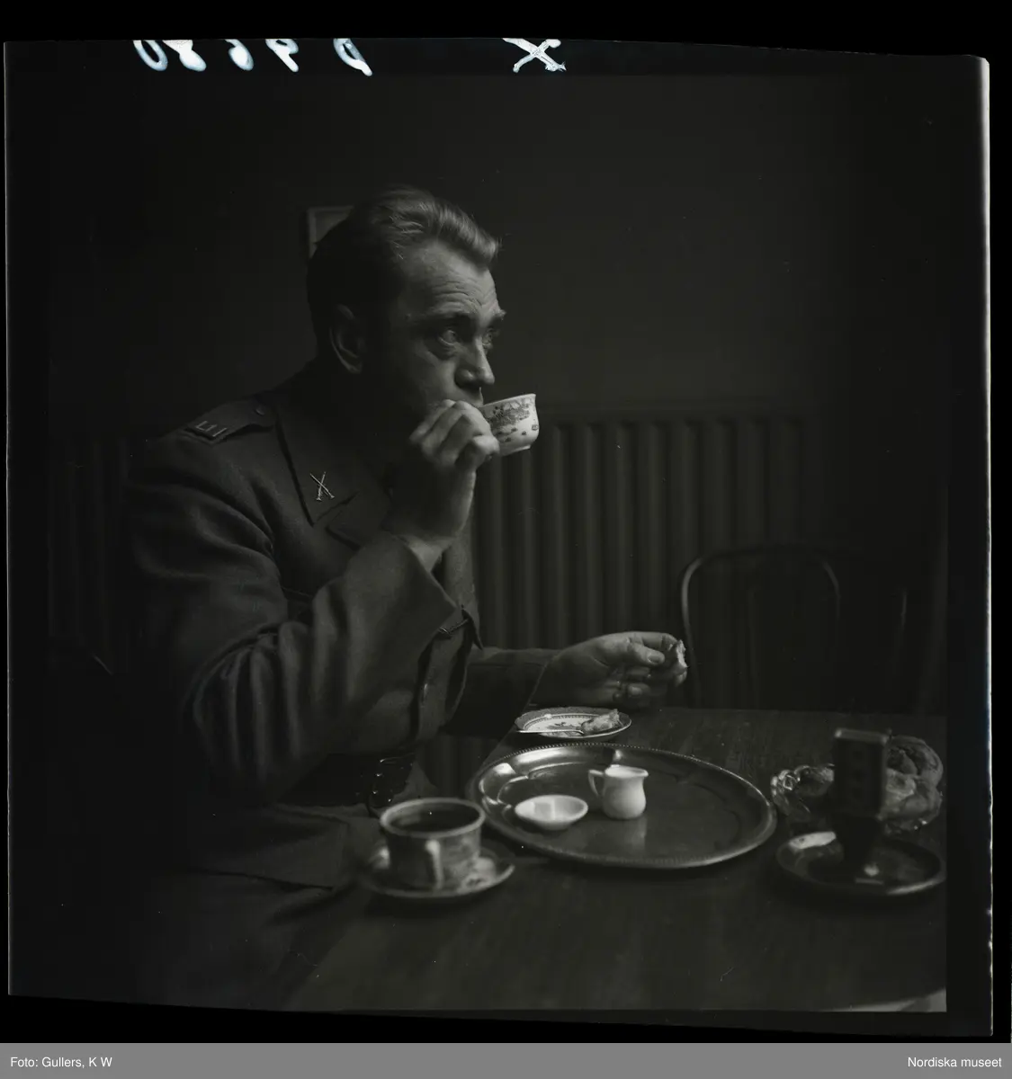 558 Wilhelm Moberg.Vilhelm Moberg på café i uniform.