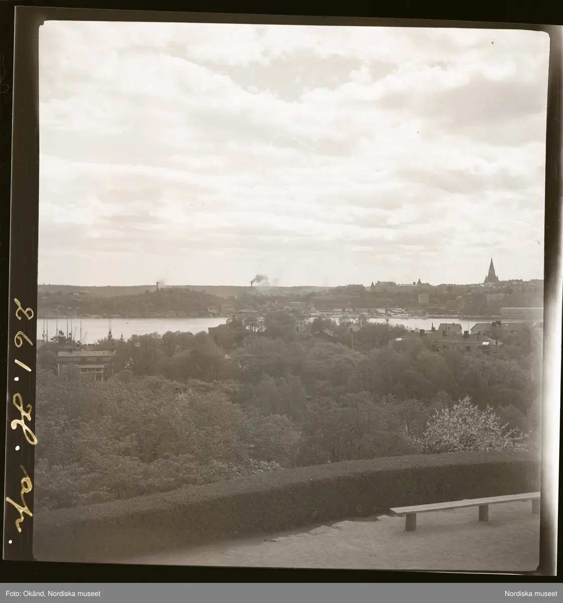 Vy från Skansen, Djurgården över Södermalm med Sofia kyrka. Stockholm.