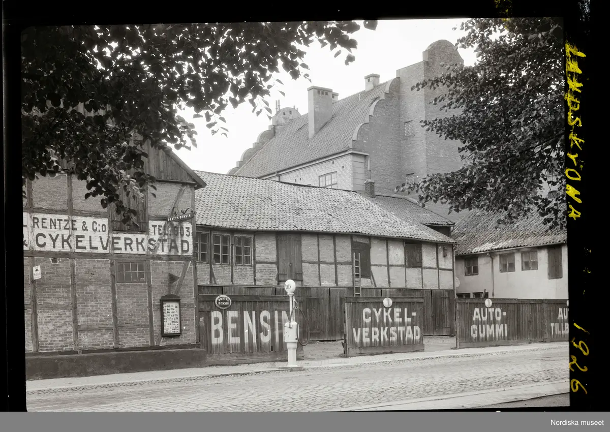 Byggnad med målad skylt på plank: Bensin. Cykel-verkstad. Auto-gummi. Axel Rentze & Co.