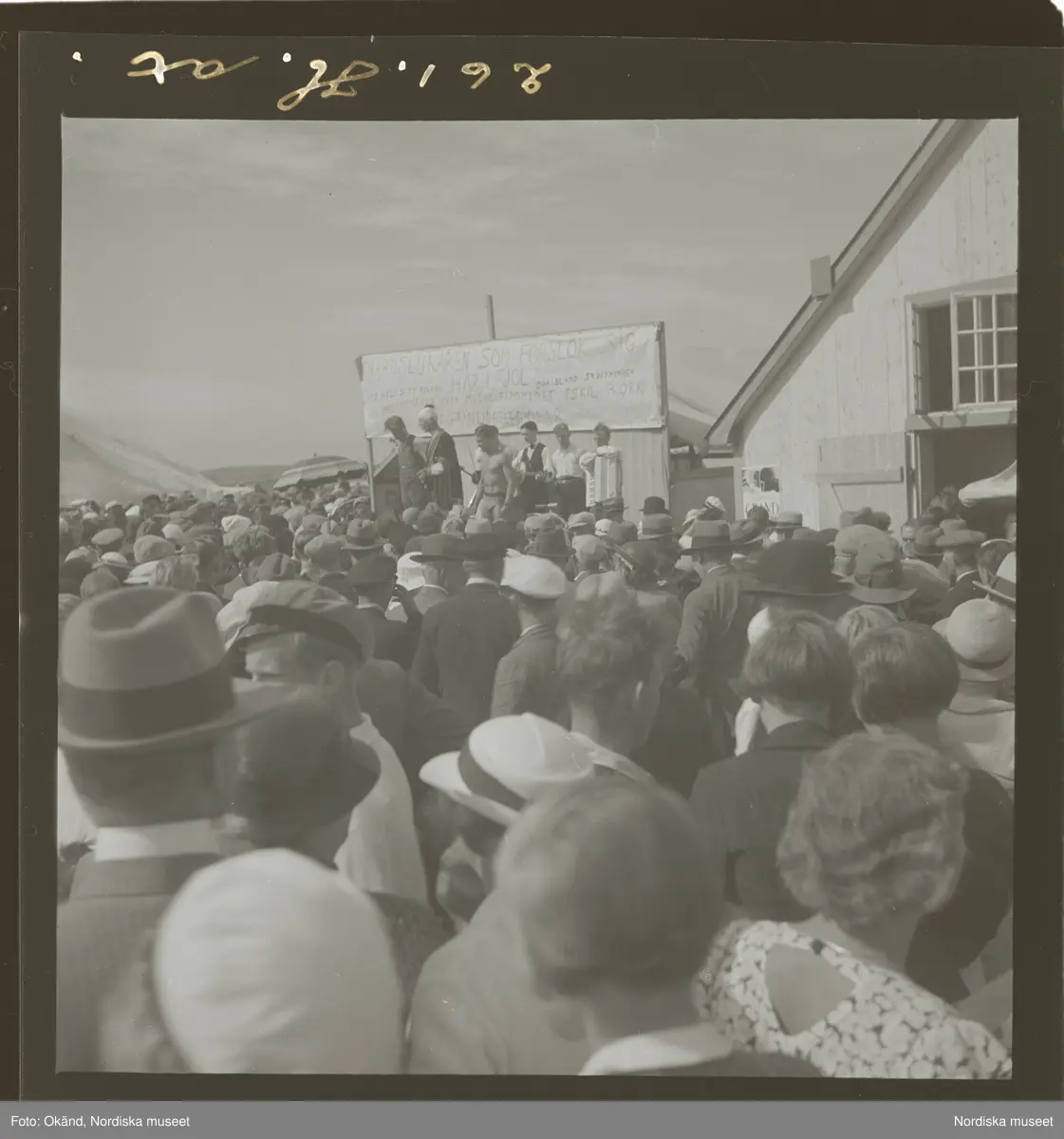 Folksamling framför liten scen på marknad/ nöjesfält. Text på skylt: "Svärdslukaren som förslök sig här i fjol, uppträder endast några få gånger med hela sitt program, däribland skjutningen. Här inne uppträder även muskelfenomenet Eskil Björk ?d Främlingslegionär kraftprov "