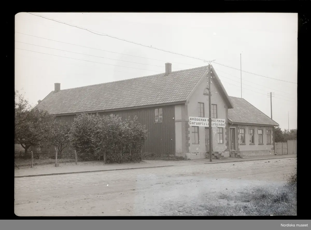 Byggnad med skylt: Bröderna Bergström. Garveri & Läderhandel.