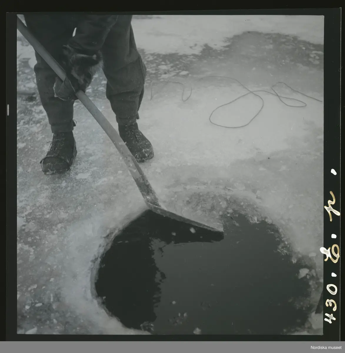 Vinterfiske på sjön. En man skyfflar is i ett hål man gjort i isen.