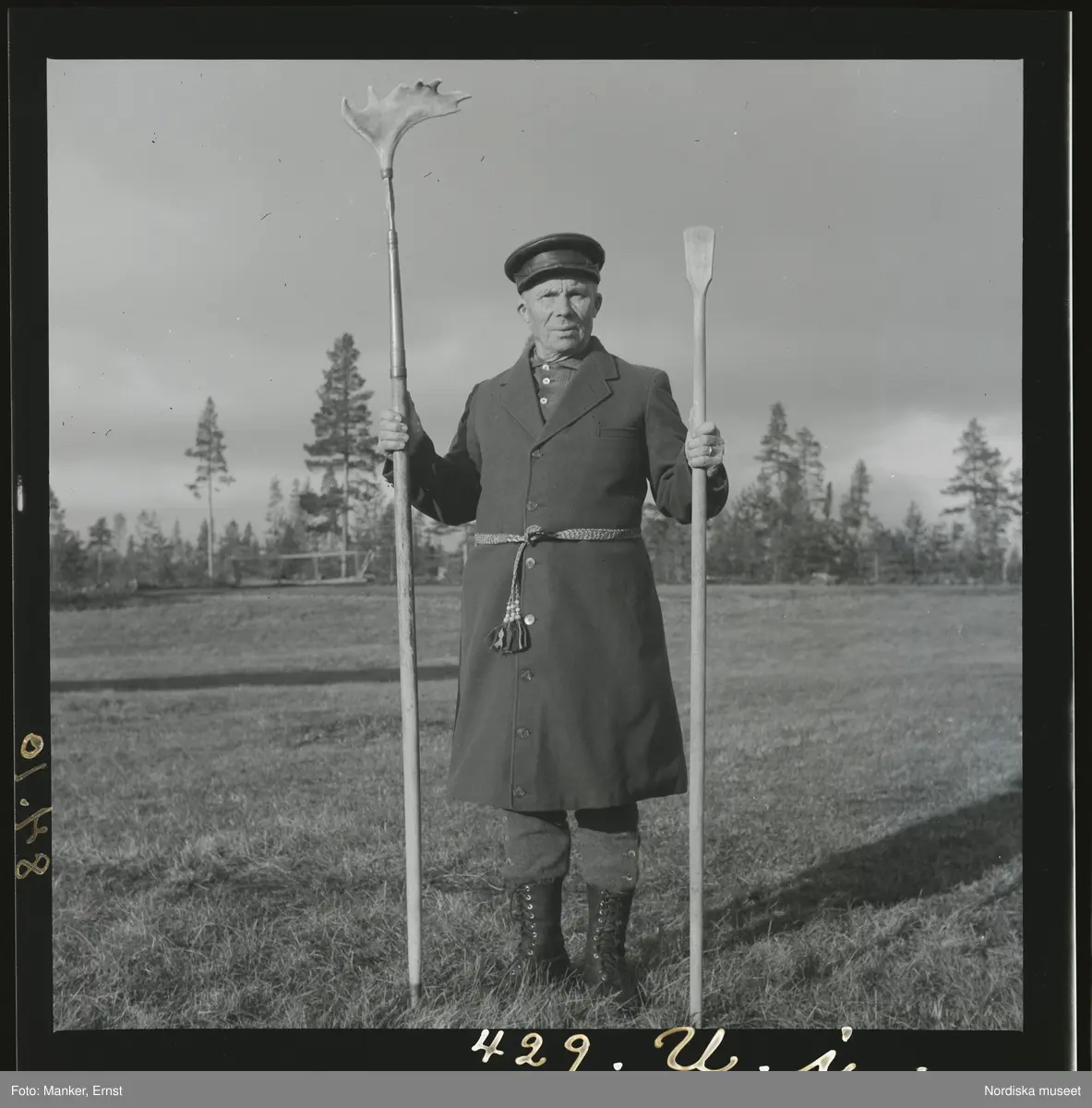 Nils Petter Stenberg, byordningsman i Västra Kikkejaur håller en samisk skidstav och sitt björnspjut med spjutholk av älghorn.