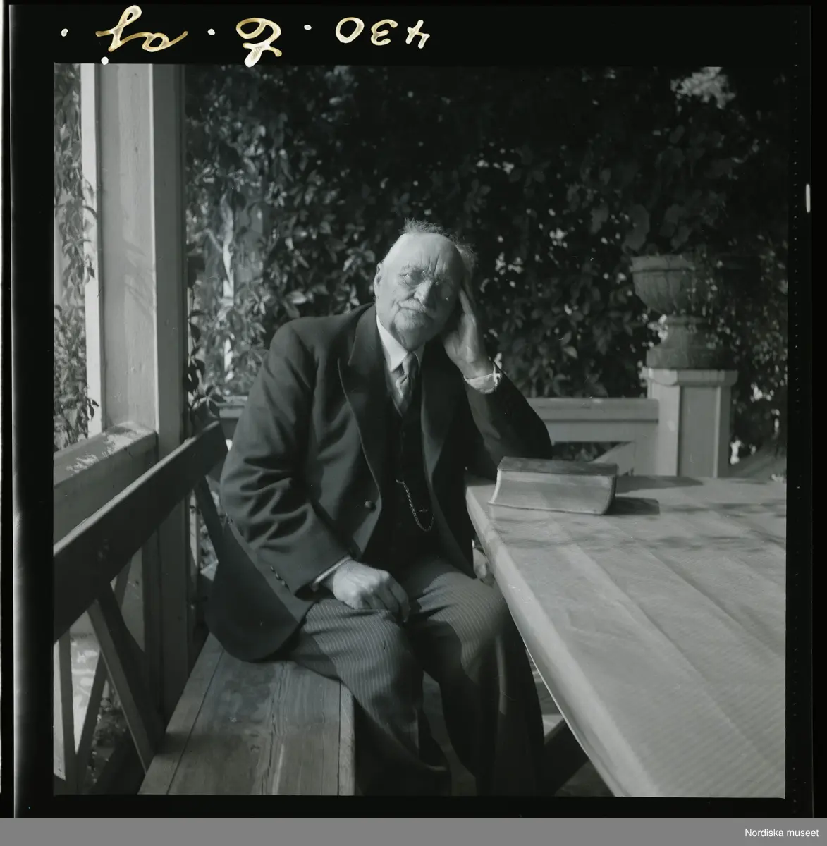 En man med en bok framför sig, sitter på en veranda omgiven av grönska.
