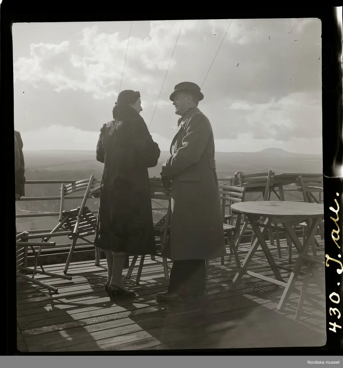 Nordiska museets utställning av folkkonst och Svenska slöjdföreningens utställning av modern svensk brukskonst i Prag, Tjeckien. Från en under utställningen anordnad utfärd. På bilderna syns professor Lundblom, fru Malmar, minister Malmar, konstnären Kåge.