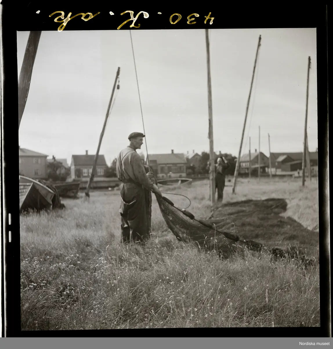 Text på montering i arkivet: Bottengarnen hissas upp på pålarna.
