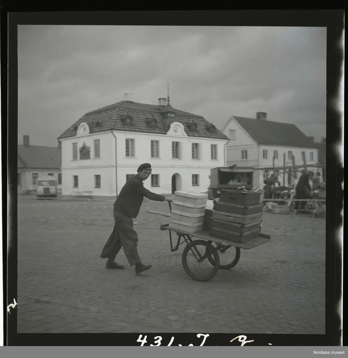 En ung man skjuter en lastad kärra över Stortorget, Laholm.
