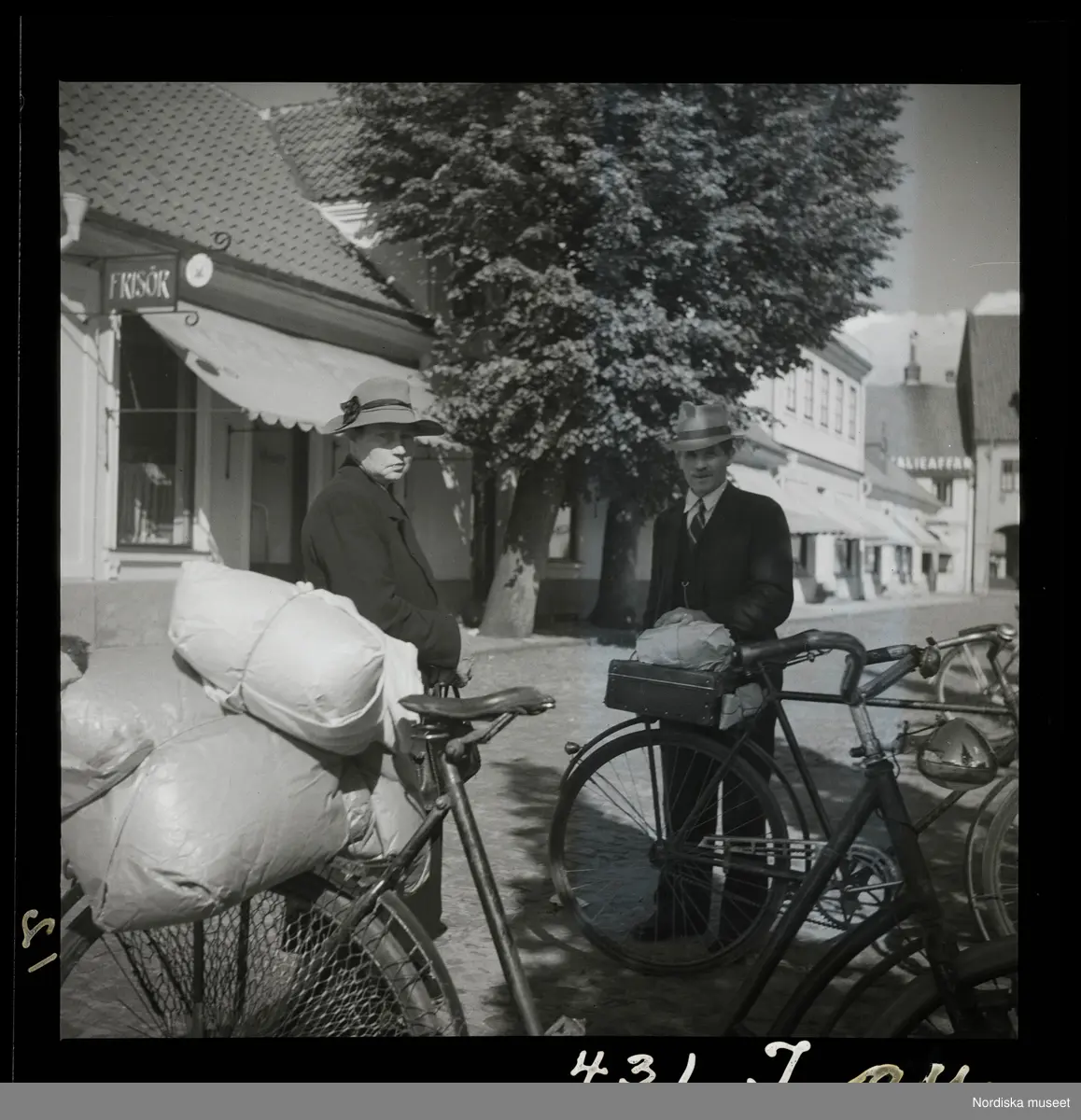 Två män med lastade cyklar på Stortorget, Laholm.