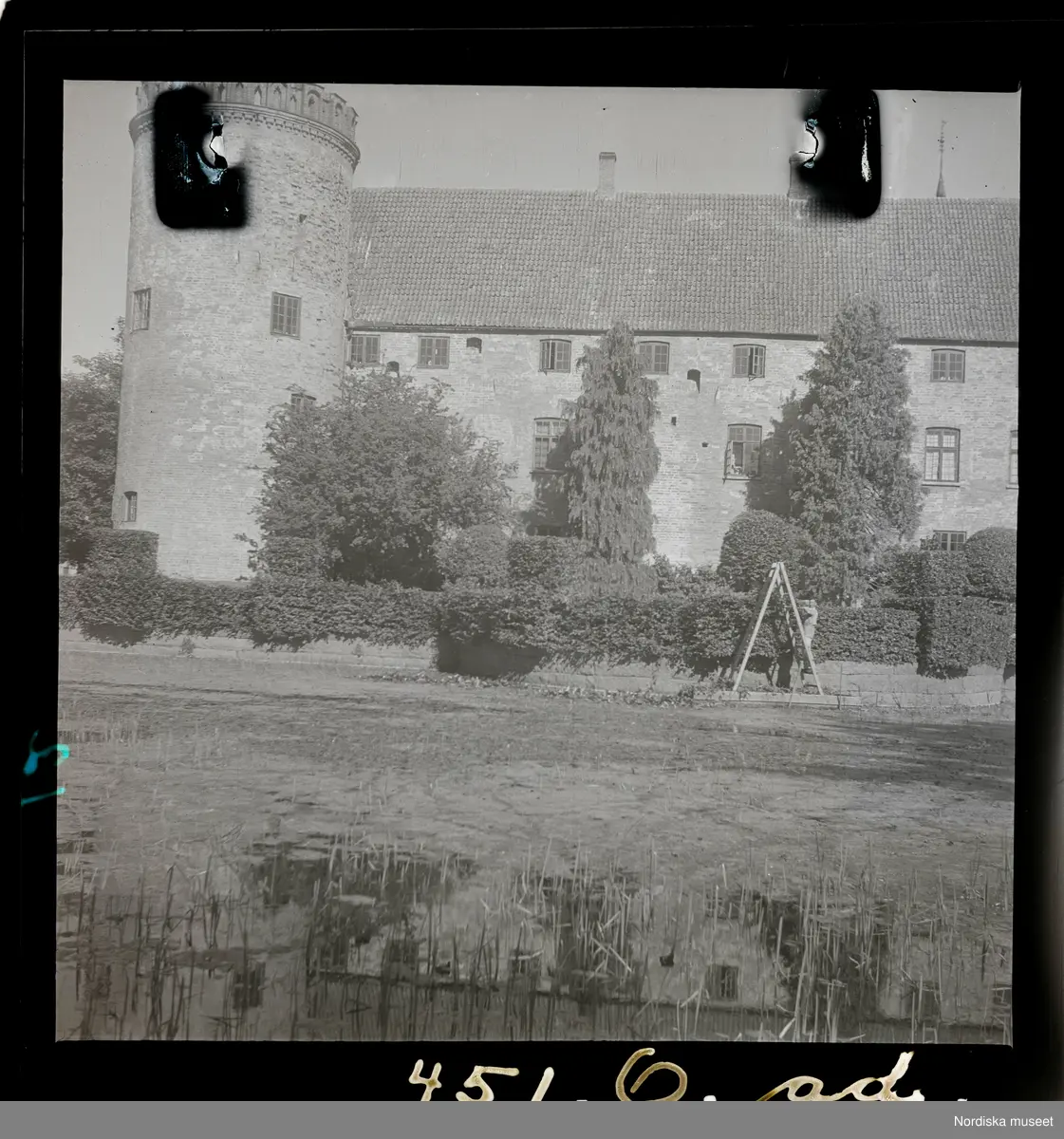 En man står på en stege och formklipper en häck framför Vittskövle slott. Skåne.