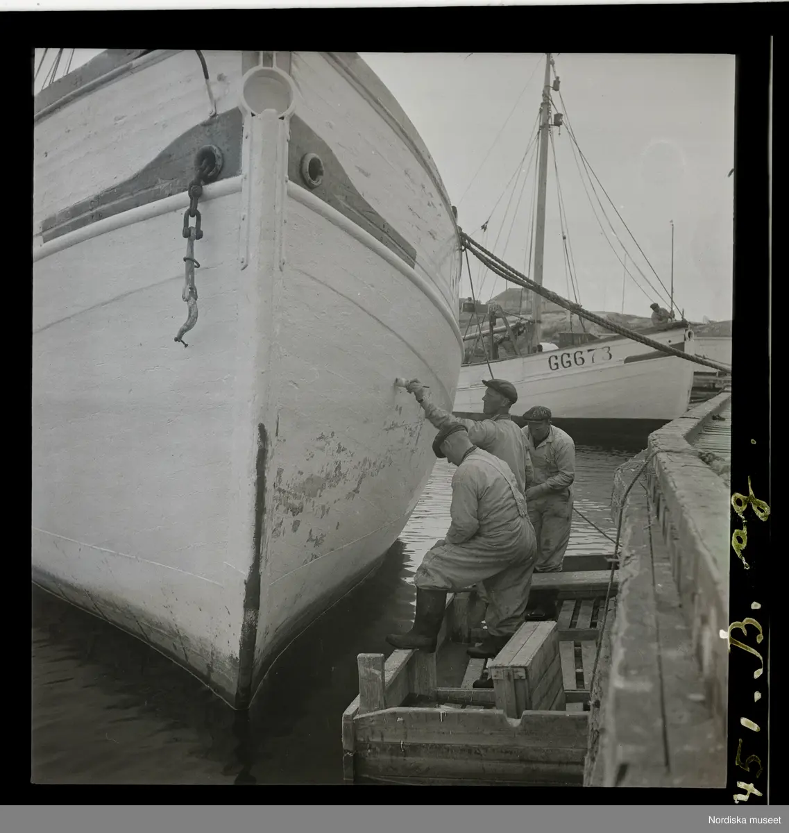 GG 628 Neptun under ommålning i Vrångö hamn. Vid målningsarbetet används flottar med låga relingar. Axel Magnusson, Evert och John Karlsson (Axel i Håla, Evert te Billas och Jon te Kålles) arbetar.