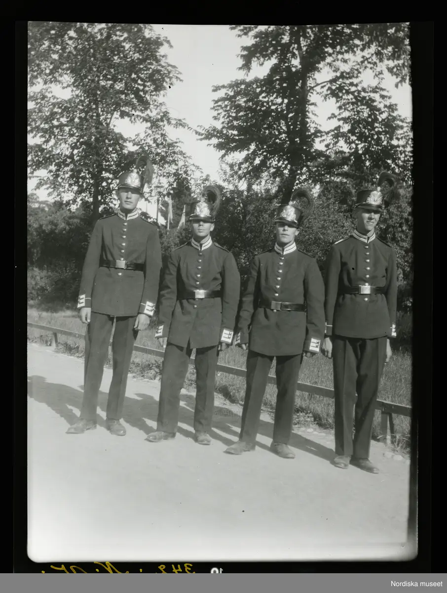 Porträtt av fyra män i uniform. Skansen, Stockholm.