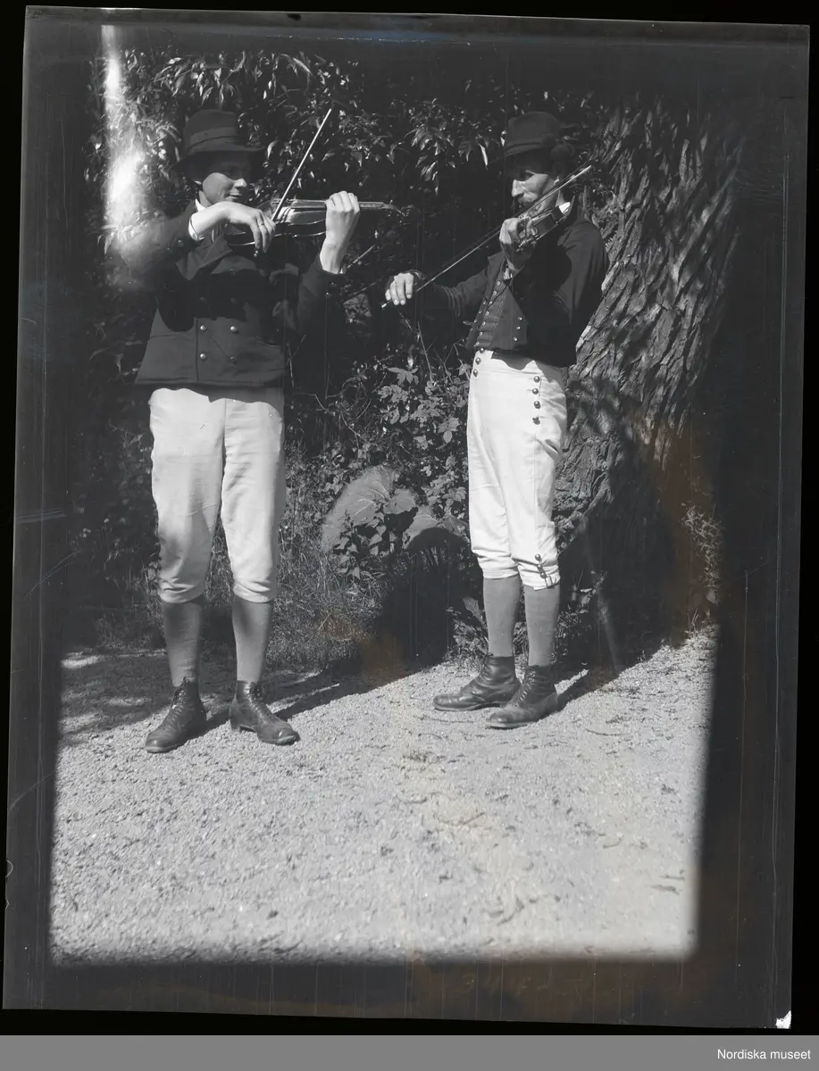 Porträtt av två män i folkdräkt som spelar fiol. Skansen, Stockholm.
