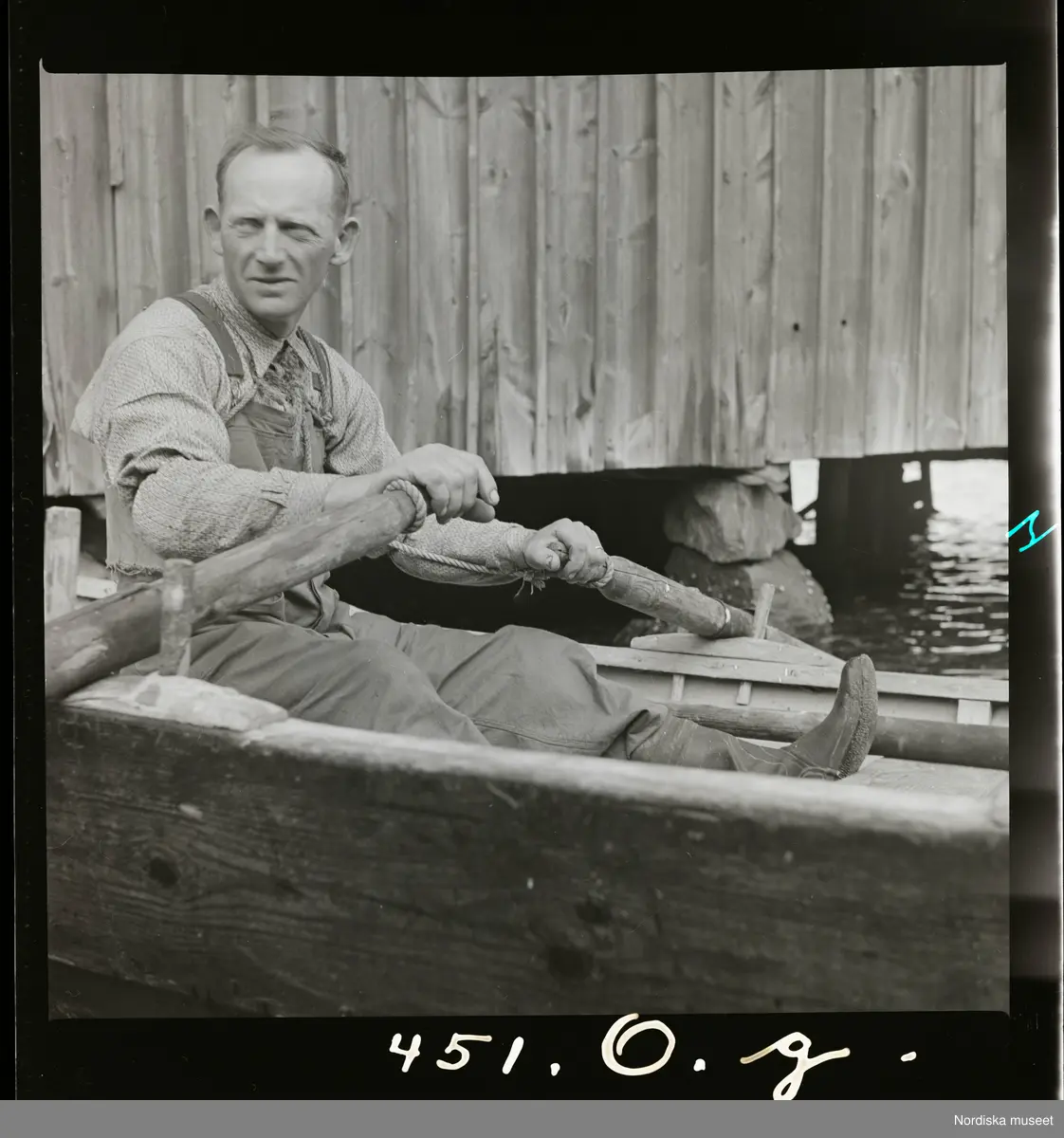 Man sittandes i eka med årorna knutna kring kroppen.