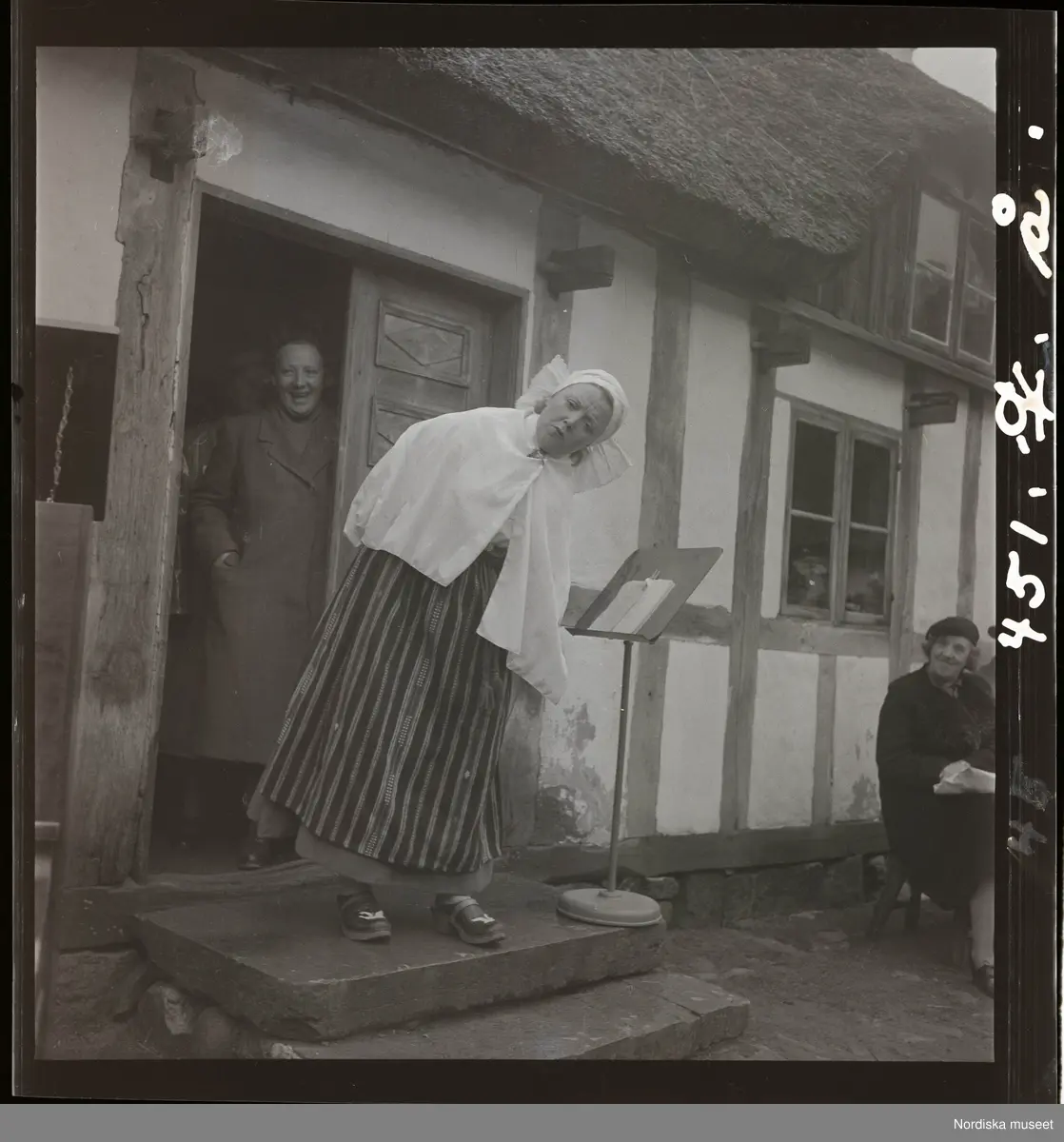 En kvinna i folkdräkt står på trappsteget in till ett hus och sjunger och spexar. Skansen, Stockholm.
