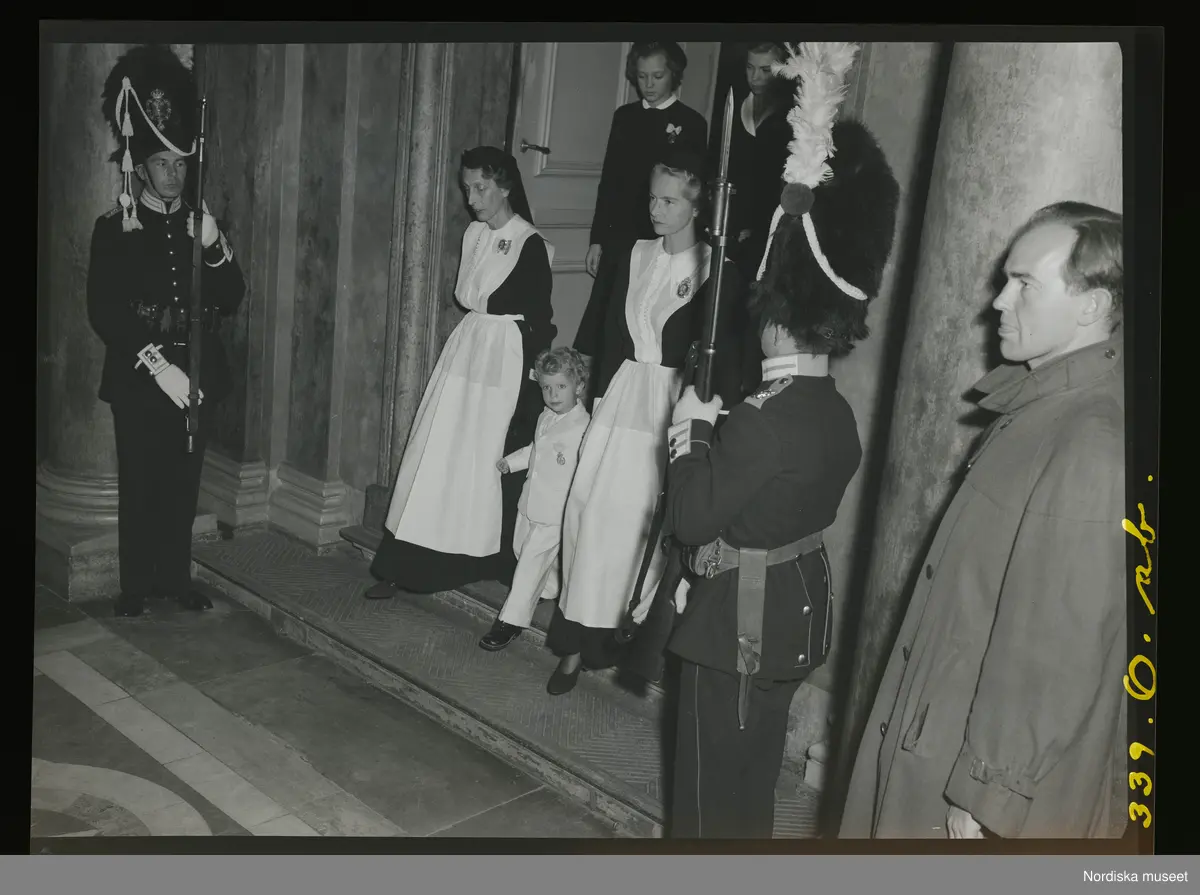Bilder tagna i samband med Gustav V:s död och begravning 1950. Drottning Louise och prinsessan Sibylla och kronprinsen på väg in i Rikssalen.