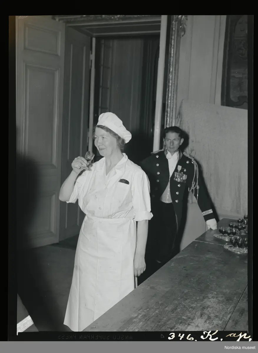 En kvinna i kökspersonalen smakar på drycken som ska serveras i ett litet glas.