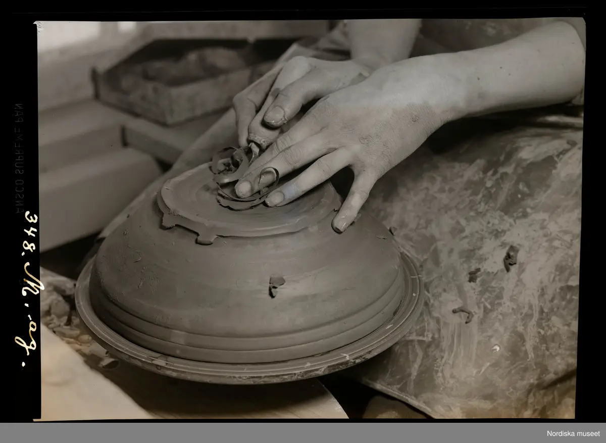 Närbild på händer som bearbetar en drejad skål.