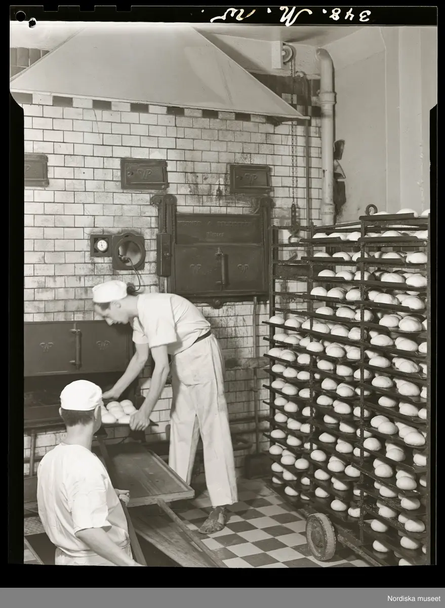 Bageri. Semlor bakas, en ung man ställer in en plåt i ugnen.