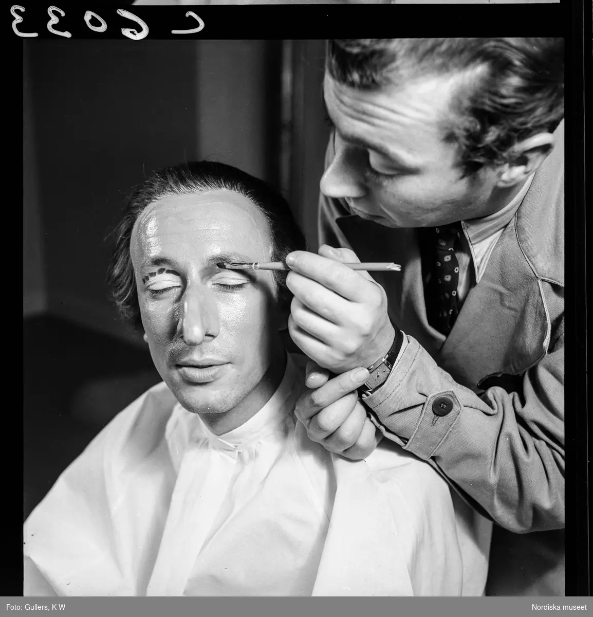 Skådespelaren Gunnar Sjöberg blir sminkad av kollega under föreberedelser i en sminkloge.