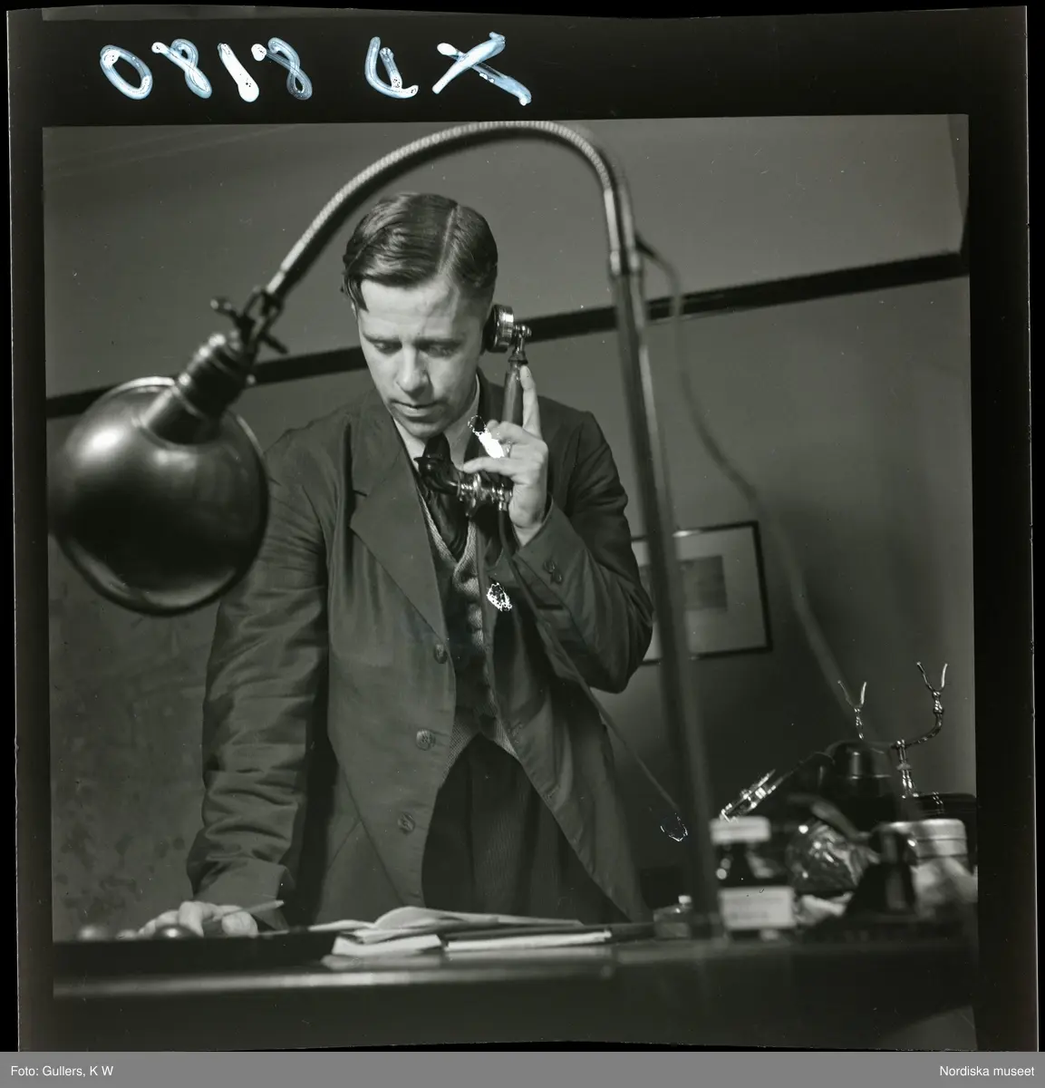 Journalist P. Wange talar i telefon vid sitt skrivbord på Norrköpings tidningars redaktion.