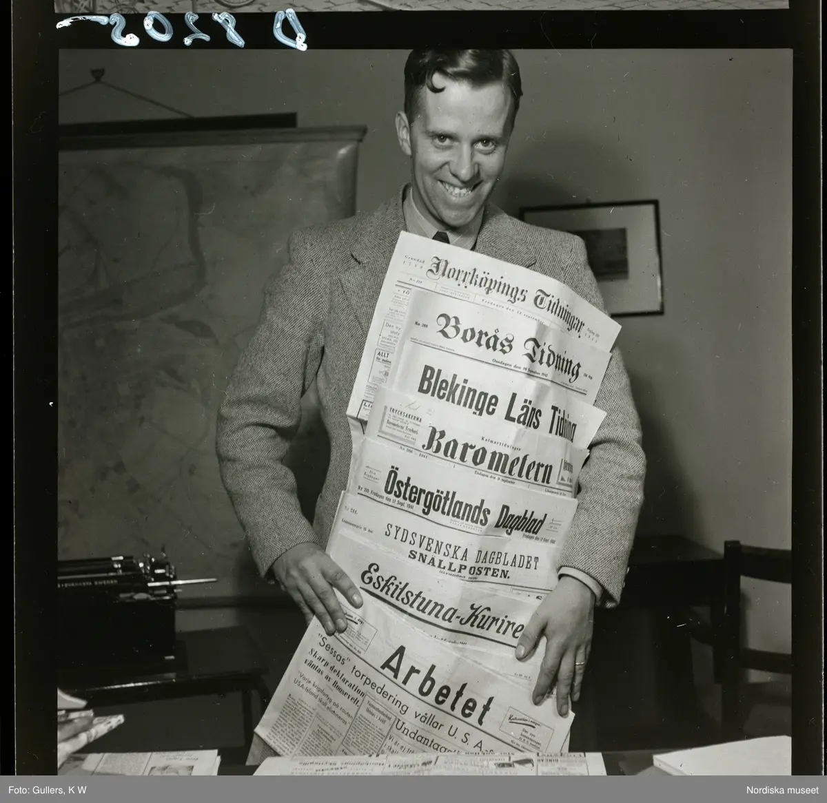 Journalist P. Wange med ett antal olika dagstidningar i famnen.