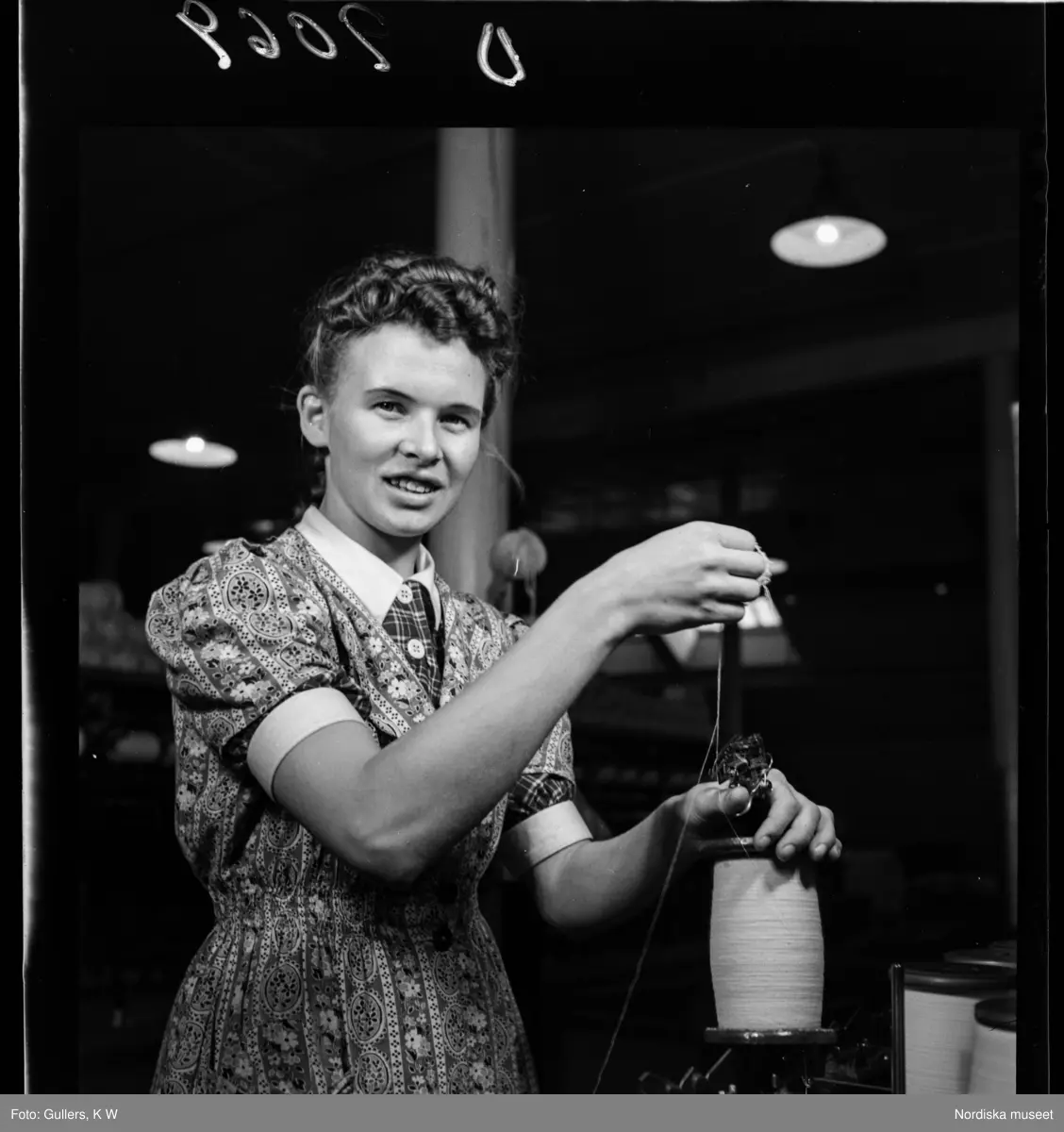 Kvinnlig arbetare med en stor rulle sytråd, i tekoindustrin på Borås Wäfveri.