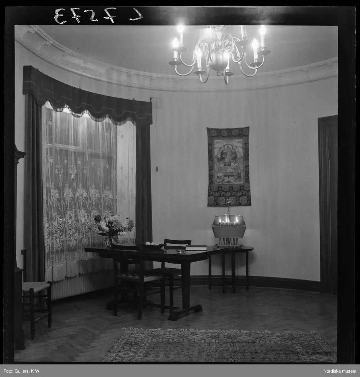 513 D Spooners Hemma hos redaktör Karlströmer. Ett bord framför ett stort fönster i ett rum med välvda väggar.