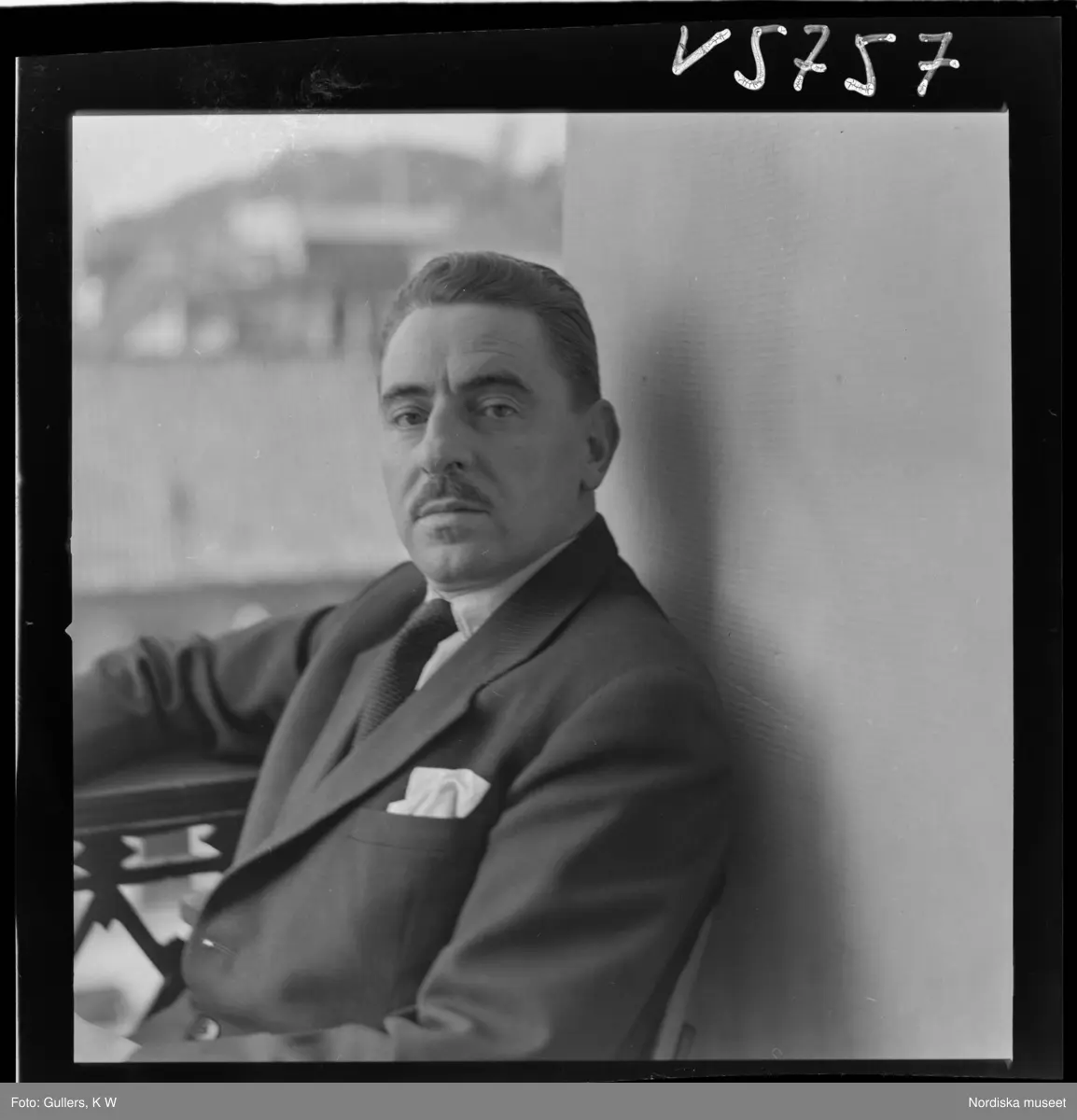 Titel: 513 H Runar Karlströmer Porträtt Hälsingborg. Porträtt av Runar Karlströmer sittandes på balkong.