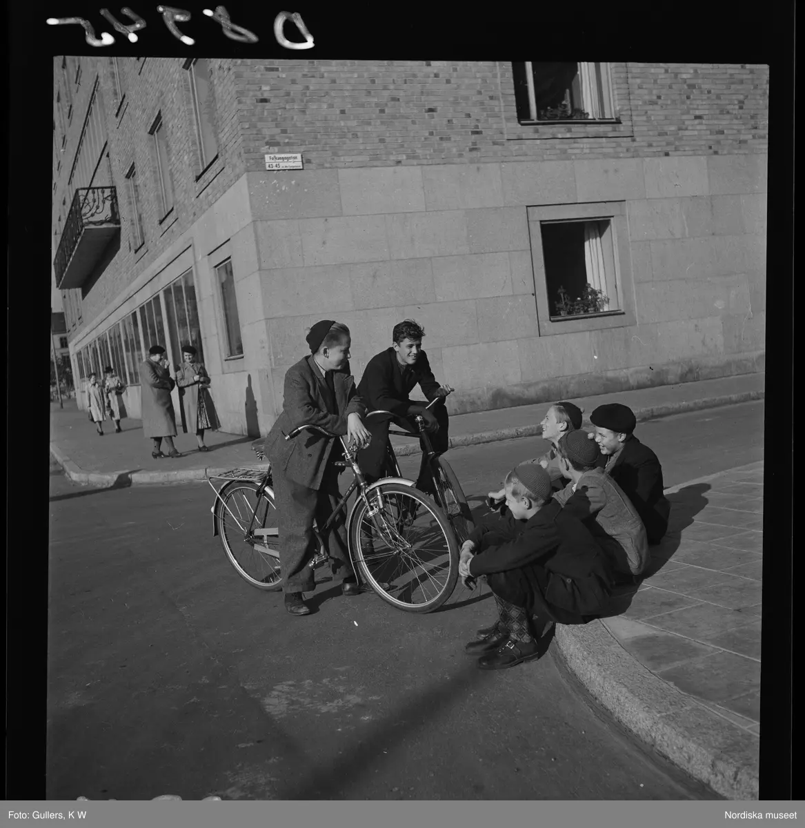 539 Söder. En grupp pojkar umgås ute på Folkungagatan. Några sitter på trottoaren, ett par har stannat till med sina cyklar.