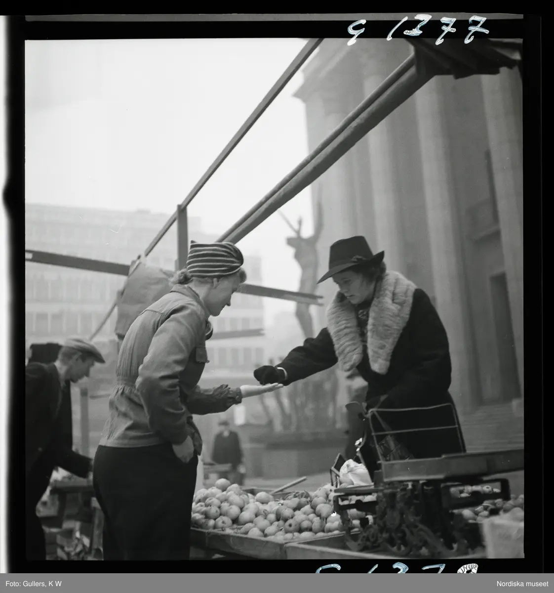 542 Dimma. Handel på Hötorget. En kvinna köper äpplen.