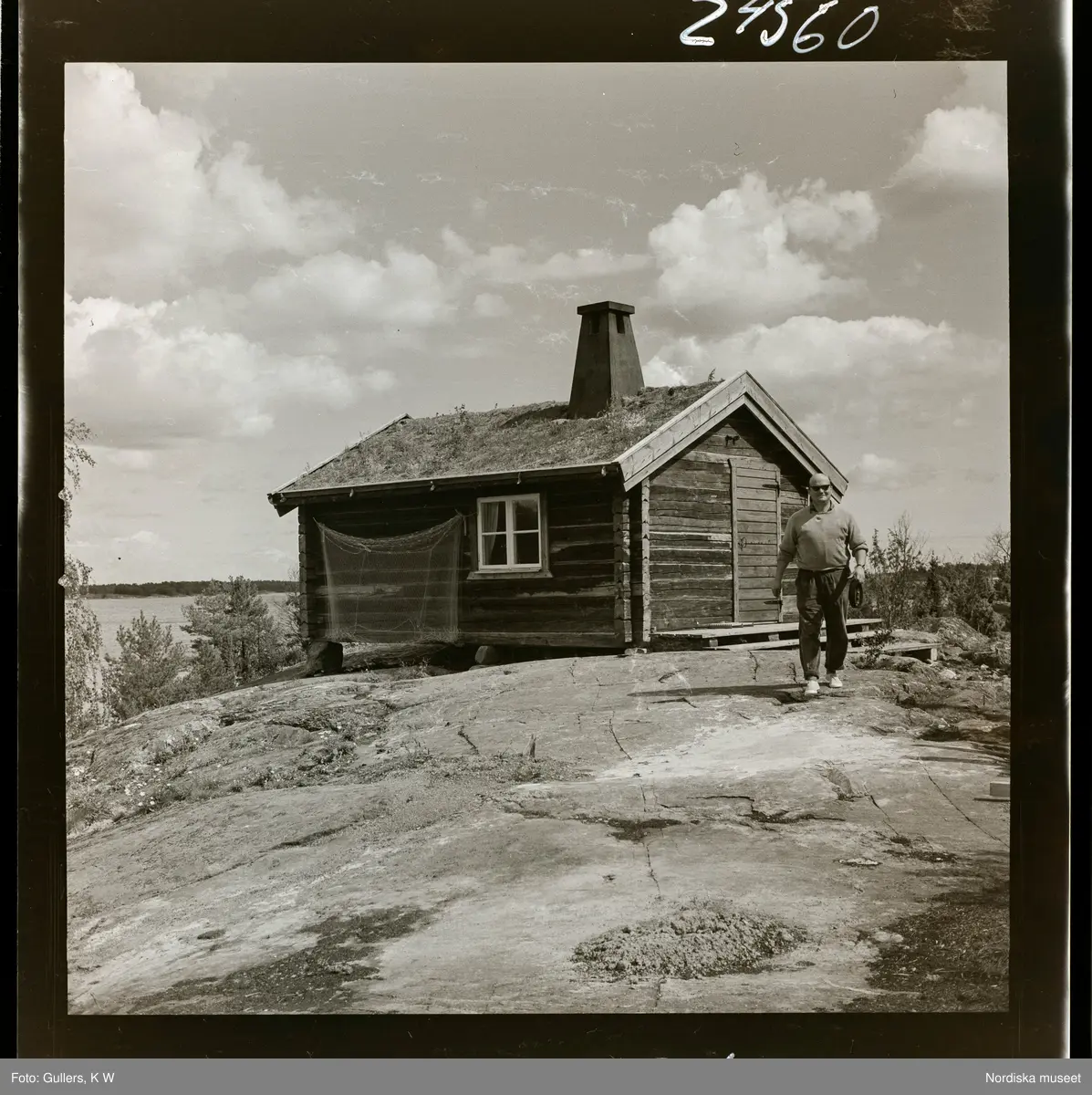 Ön Lilla Brudholmen. Stieg Trenter framför en stuga på en klippa.