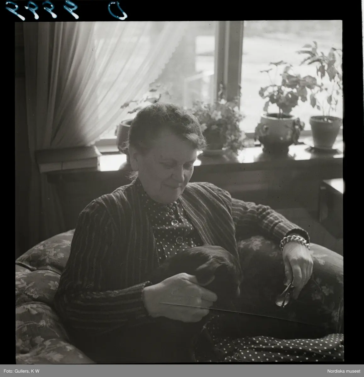 564 Vårgårda Havregryn. En kvinna sitter i en fåtölj med en hund i knät.