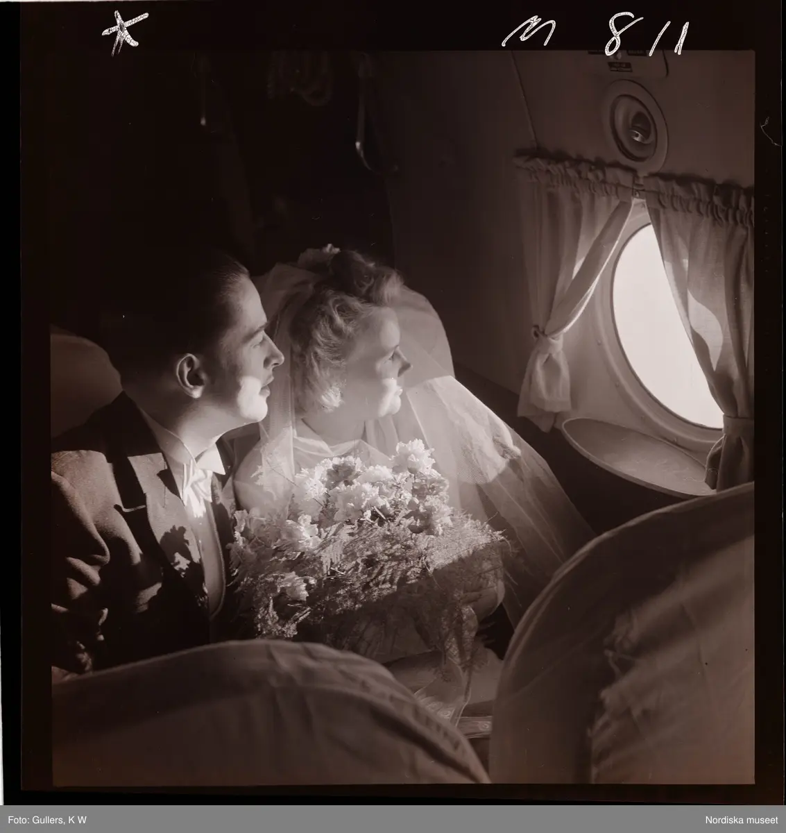 "1680 Bröllop i luften med Abas DC-4 ""Sunnan"" till Paris " Ett brudpar sitter och tittar ut genom fönstret i ett flygplan.