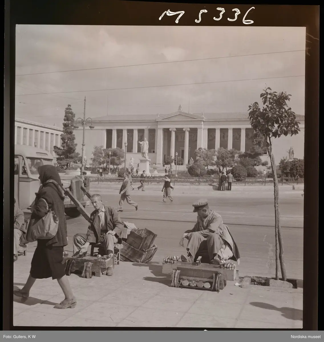 1717/H Aten. Gatuförsäljare sitter på trottoarkant.
