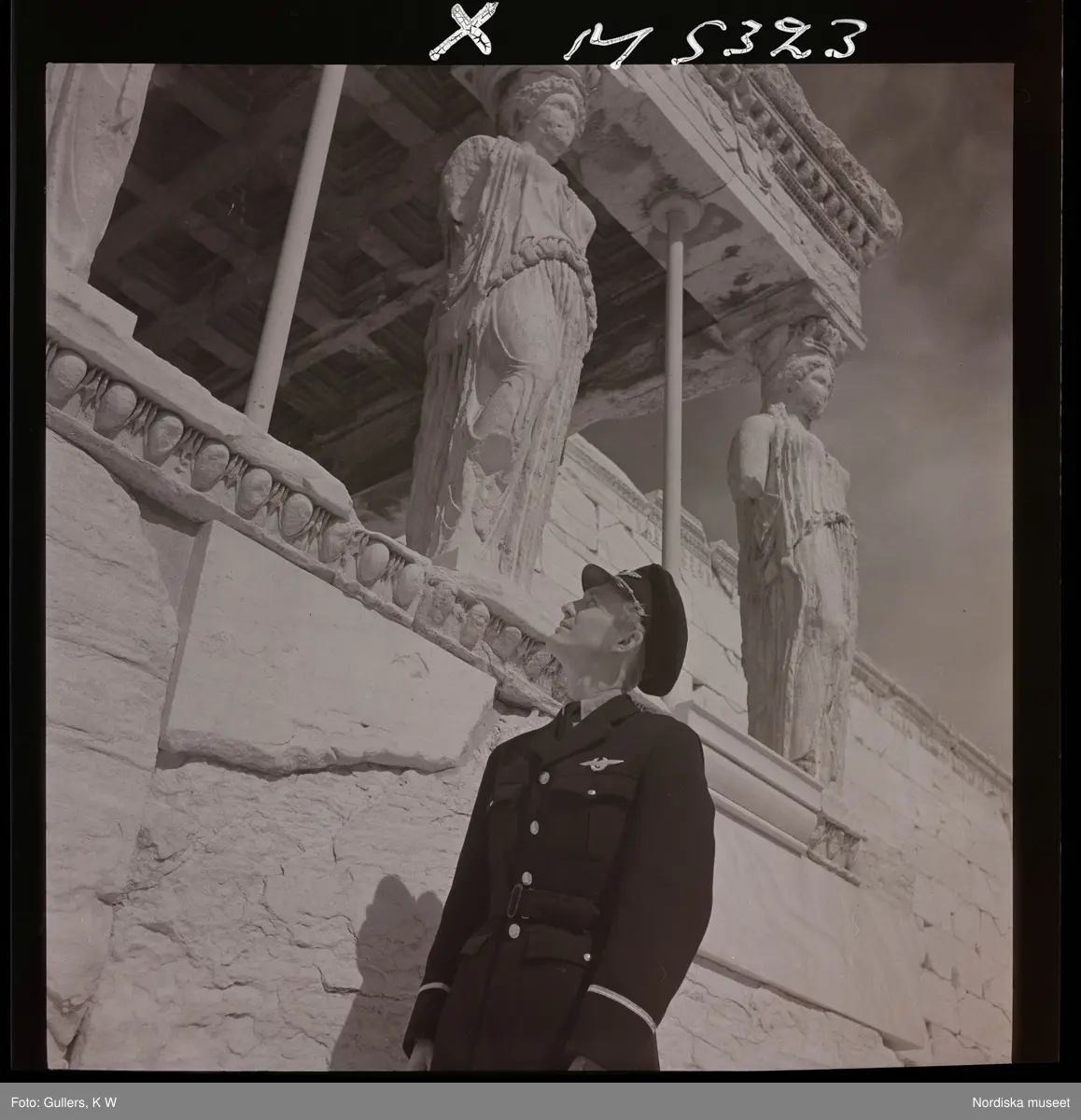 1717/H Aten. En man i uniform framför skulpturerna på Erechtheion-templet, Akropolis.
