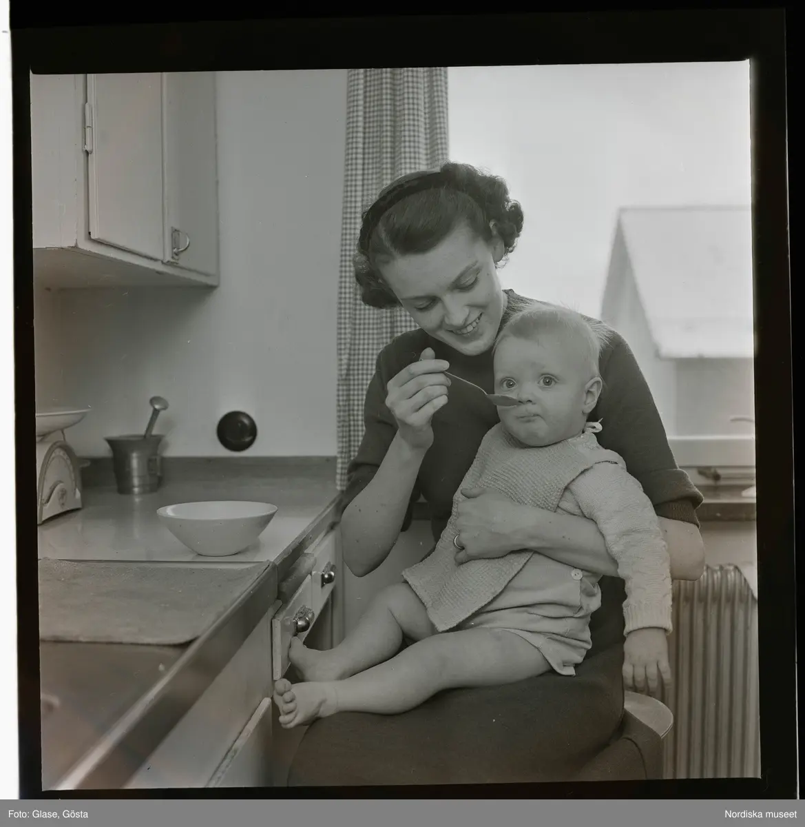 En kvinna matar ett litet barn som sitter i hennes knä, vid diskbänken i ett kök.