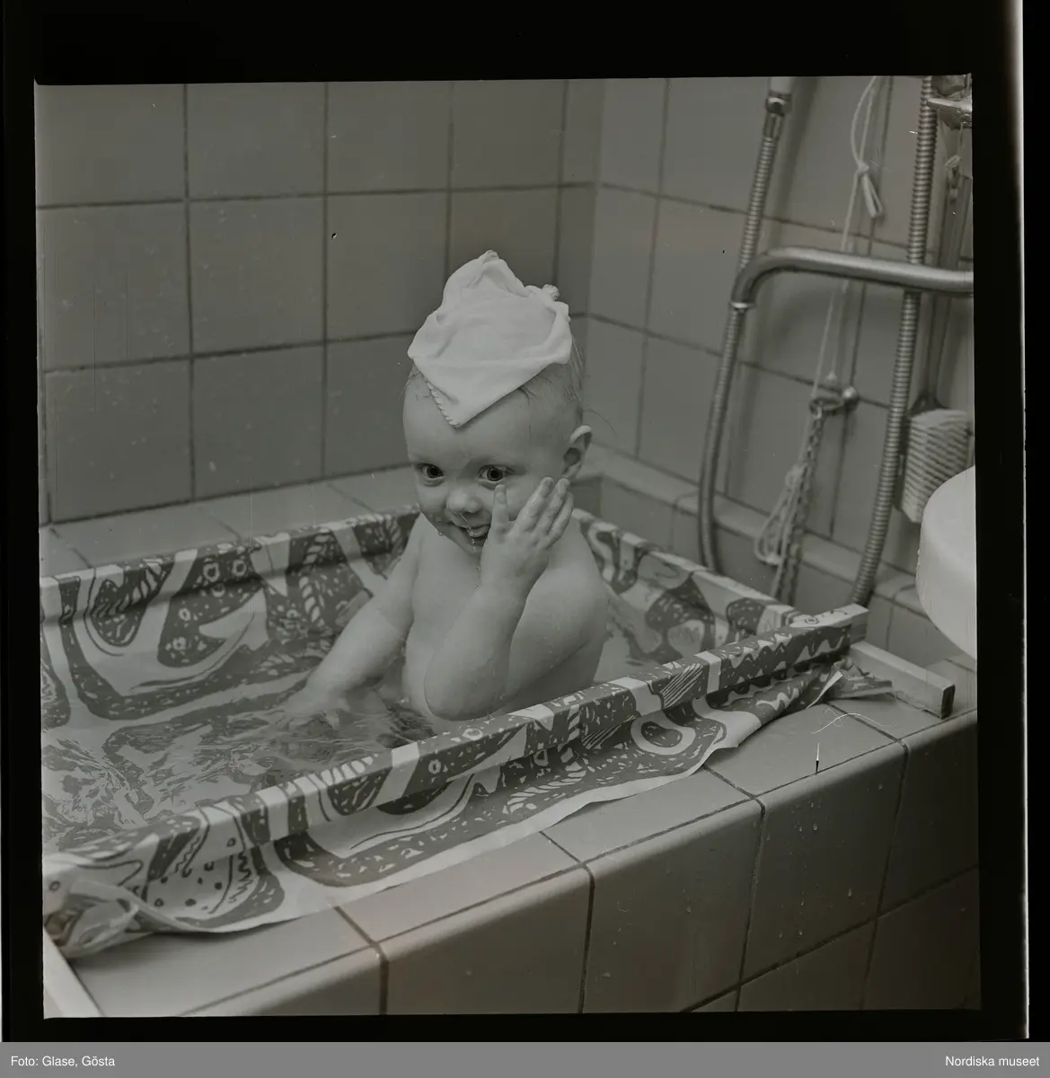 Ett litet barn sitter i ett badkar med en tvättlapp på huvudet.
