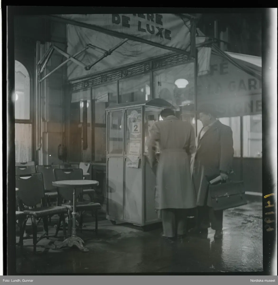 2 december 1950. Paris. Två män vid ett litet stånd utanför ett café, kvällsbild.