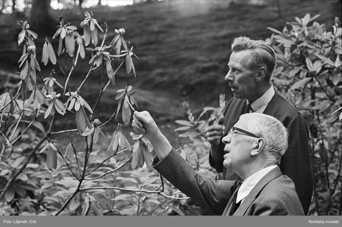 Kung Gustav VI Adolf med studerar Rhododendron med sin trädgårdsmästare på Sofiero.
