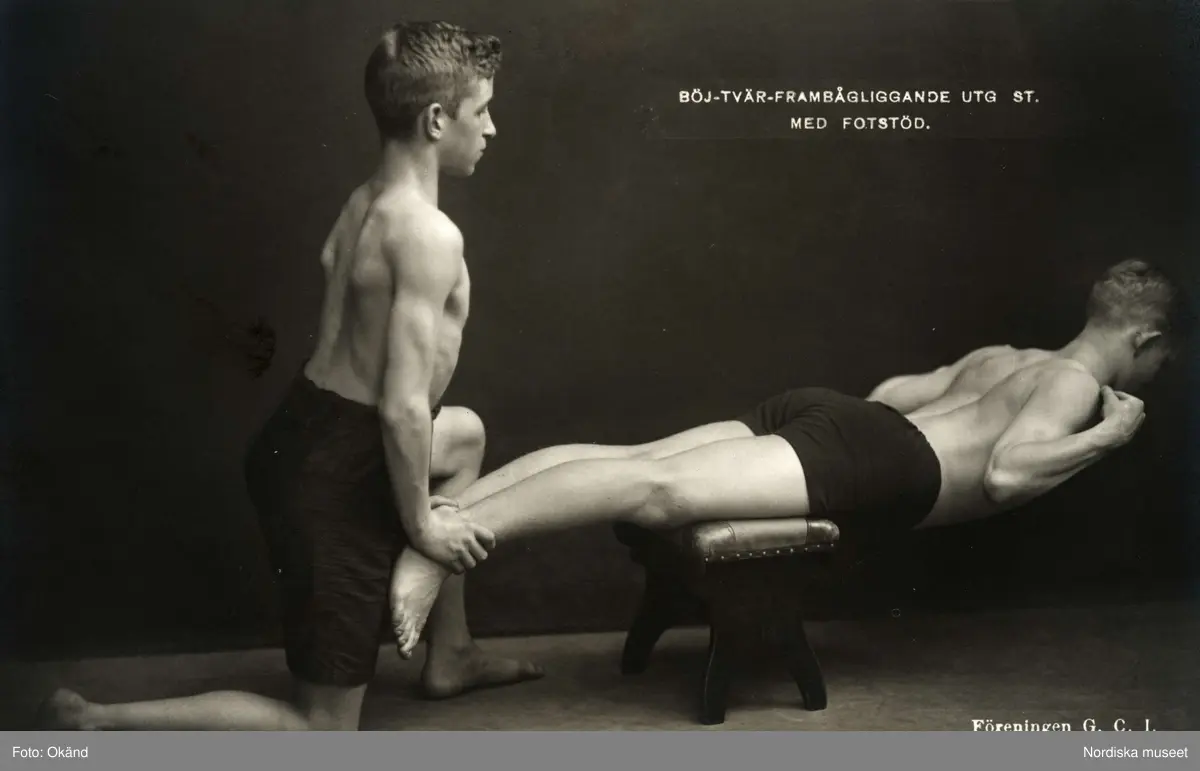 Två unga män gör gymastik. "Böj-tvär.frambågliggande utg. st. med fotstöd." Vykort N:o 5 utgivet av föreningen G. C. I. / Gymnastiska Centralinstitutet