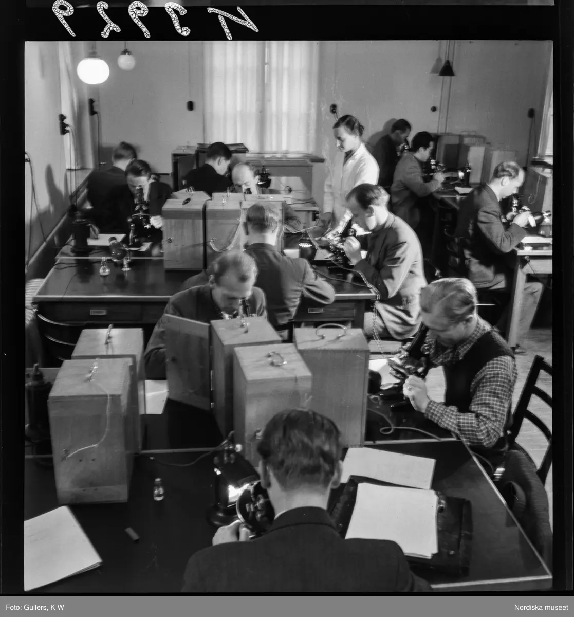 507 D Ultuna. I ett klassrum. Studenter studerar något i mikroskop.
